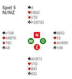 West heeft dus de mogelijkheid om een snapdragon doublet te geven als je dat hebt afgesproken. Dat is best een leuke afspraak, zeker als je je realiseert dat Oost zomaar eens een driekaart mee kan hebben! Zeker in een parenwedstrijd kan de 5-3 fit interessanter zijn dan de 5-3 fit. Wij spelen deze conventie overigens niet, omdat we vooralsnog ons systeem simpel willen houden. Marlon, mijn partner die West zat, bood 2. De tegenpartij kwam in 3 terecht en na mijn uitkomst taxeerde ik mijn partner op een 4-kaart en dat was een dure inschattingsfout. Daardoor maakte de leider een overslag en kregen we een slechte score op dit spel. Als je zo even door je oogharen naar het spel kijkt, lijkt het of de leider altijd wel 9 slagen heeft in het contract van 3. Maar als Oost na Aas Heer speelt, kan hij later een introever in krijgen als West die kleur 2 keer terugspeelt, of eerst het Aas duikt en na met troef Aas aan slag gekomen te zijn, alsnog doorspeelt. Die speelwijze werd gevonden door Fred Heemskerk & Kees Schipper, die daar een redelijke score aan over hielden. Geen top, want een NZ-paar bood 2 en ging kwetsbaar 2 down.