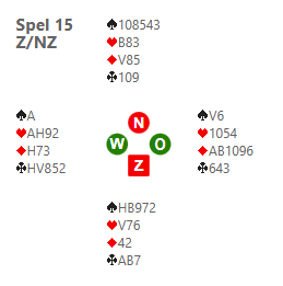 Er werd gestart met een , Zuid dook goed zijn aas. Je gaat naar dummy via de snit op Q (pfff, die zit goed) en speelt een . Het spel kon niet meer down.