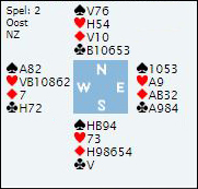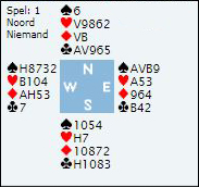 De ruiten blijken niet te lopen, maar Jeroen zag de extra mogelijkheid. Noord heeft 1 geboden,maar is niet uitgekomen met H. Grote kans dat zuid Hx of Vx heeft. Hij speelt dus een kleine harten onder zijn aas uit. Zuid nam H, waarna V er bij noord uit gesneden werd voor slag 10. Een kleine harten zetten helpt niet, want dan wordt H er de volgende slag uitgeslagen. Mooi gespeeld!