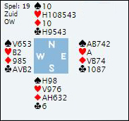 Het volgend spel mocht hij meteen weer aan de bak in een scherpe 4. Zuid had 1 gevolgd op 1 zodat noord, zoals op de meeste tafels, startte met V en dus ontsnapte aan de dodelijk schoppen start. In de dummy wordt A genomen en meteen een kleine ruiten na. Als zuid een vijfkaart had gehad, had hij een probleem gehad (west kan 10 hebben), maar kon nu met een gerust hart duiken. Jeroen troeft, laat V doorlopen en speelt een 2e troef voor A.