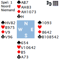 Wij zitten NZ. O opent met pas, ik, Z bied 1 Maar bij ons na het biedverloop, 1♣️, 1♥️, 2♦️, 2♠️ A, 3SA daarentegen wel. En als je dan ook nog deblokkeer is 3SA in gevaar. Gelukkig werd ik geholpen na de goede start door Jeroen, omdat hij de A legt (2e man klein!) toen ik uit de hand kleine ruiten voorspeelde. Maar wat doe ik als Jeroen klein legt? Met open kaarten is het niet moeilijk. Volgens mij is de T het meest kansrijk, maar dat is achteraf gepraat. Na de start telde ik 7 vaste slagen en zag dat ruiten mij tenminste 2 slagen moest opleveren en dat ik maar 1 keer van slag mag gaan. Met dit tegenspel heb ik mij verzekerd van 9 slagen en was overtuigd van op zijn minst een redelijke score. Hoe groot was mijn teleurstelling toen bleek dat ik een bijna 0 had. 11 paren boden 3SA. 7 paren kregen een ruiten start, waarmee 10 slagen verzekerd zijn. Eén paar de start met harten 8, waarmee ook 10 slagen verzekerd zijn en één paar ook een kleine schoppen, maar de leider maakt toch 10 slagen. Is de start ven een kleine ruiten opgelegd? Bij ons niet, want ik bood ruiten, maar bij Z spelers die toch 1SA openen, ook niet, want de hoge kleuren worden dan door Z ontkend, zodat de kans op een 5332 of 4432 verdeling met de lengtes in de lage kleuren voor de hand ligt en smeekt om een start in een hoge kleur. Of heb ik het overvloedige eten en drinken van de afgelopen weken niet goed verwerkt en ben ik nog beneveld? De start met schoppen 3 of harten 8 (2 paren) is dan toch maar geen verassing.