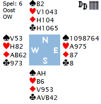 Bleef het hierbij? Neen spel 1 was mogelijk het mooiste spel van de avond. Hier missen, alhoewel ze goed op weg waren, onze tegenstanders 6, maar maken plus 2, toch nog goed voor 80%, omdat slechts 2 paren het boden en maakten en 2 paren plus 2 maakten en 3 paren in 6 down gingen. Op dit spel konden de spelers die landelijk (hoog, MK, topcircuit) spelen schitteren! Zes kan niet down als N de leider is en O start met klaveren B. Wordt met schoppen gestart ongeacht welke hand speelt dan moet de leider helderziend zijn, de H de eerste ronde duiken en de teruggespeeld klaveren voor de H van noord overnemen met het A en direct snijden op harten B door een kleine harten naar de 8 te spelen. Geen van de leiders in noord en zuid hebben deze wijze van afspelen gevonden. Hier is het de kunst het spel in de goed hand te krijgen en te duimen dat er geen schoppen wordt gestart. |