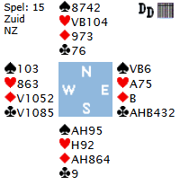 De bieding bij ons was, Z pas, W 1 Heeft O een bod na 1SA van N? Heeft W nog een bod na pas van partner en Z na het 1SA volgbod van N? Desondanks wordt N in 1SA 5 keer gedoubleerd. Helaas wordt niet vermeld wie doubleert. Ik vermoed O (9+, hooguit 2 harten, meerderheid van punten). Dat zal W bij gebrek aan beter wel inlaten. De start lijkt opgelegd, Het goede en logische vervolg lijkt klaveren, O de B en inderdaad komt Z aan slag met Ik schreef dat de start opgelegd leek (7 keer als ik de B meereken), maar ik startte toch maar in de kleur van partner met de 9, Z klein, W ook klein, de 9 is al hoog genoeg en duidt op een doubleton en N de V. Nu komt N niet verder dan 2 klaveren, 3 ruiten slagen, bij optimaal tegenspel. Helaas, het ging wel 1 maar niet 2 down. Voldoende besproken dit spel? Neen, want 2 OW paren bereiken 1SA. Dat kan niet down! Hoe wordt dat contract bereikt? Dat kan alleen als N past na de opening van 1 Het spel is niet allen een mooie illustratie van uitkomen en verdedigen maar ook de consequentie van biedafspraken (zwakke versus sterk sans en 1SA na 1 hoog, forcing voor één ronde). Na dit spel werd onze hoop op een goede avond direct getemperd in het laatste spel, spel 15, van de eerste ronde.