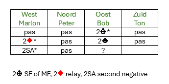 Daarna vond ik het lastig. Ik overwoog 3, maar was bang dat partner dat zou zien als een 5-krt. Bovendien levert schoppen meer punten op in parentelling en is die kleur uitstekend. Ik bood 3 en daar bleef het bij. Onze tegenstanders opperde in de nabespreking dat een bod van 3 forcing is, in hun systeem. Dan hou je nog het probleem, wat moet partner met de Zuidhand dan bieden? 3? 4? 4? Je zou ook kunnen zeggen dat ik gewoon moet hopen op een slag bij partner en gewoon maar 4 moet bieden.